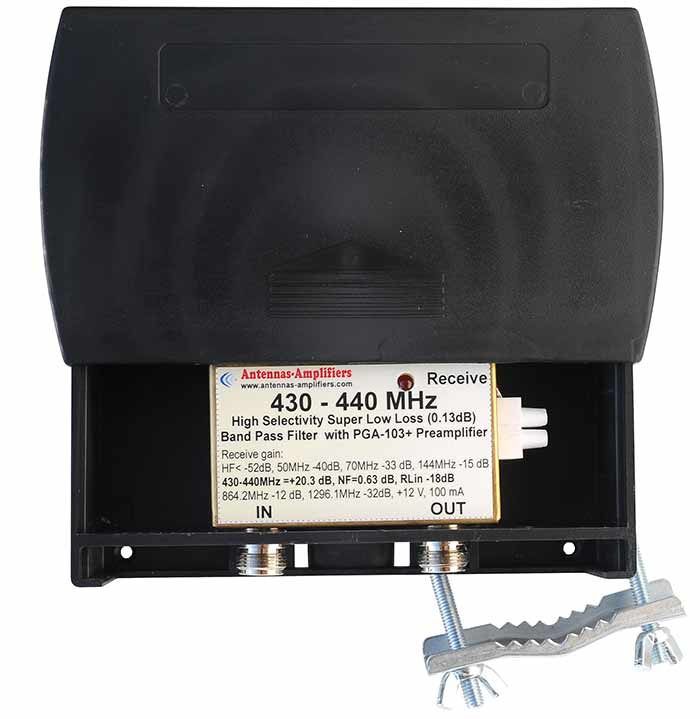 Lire les 2 avisFiltre passe-bande d'entrée à faible perte pour la bande 70cm de 430 à 440MHz avec préamplificateur à très faible bruit PGA-103+, un gain de +20dB.