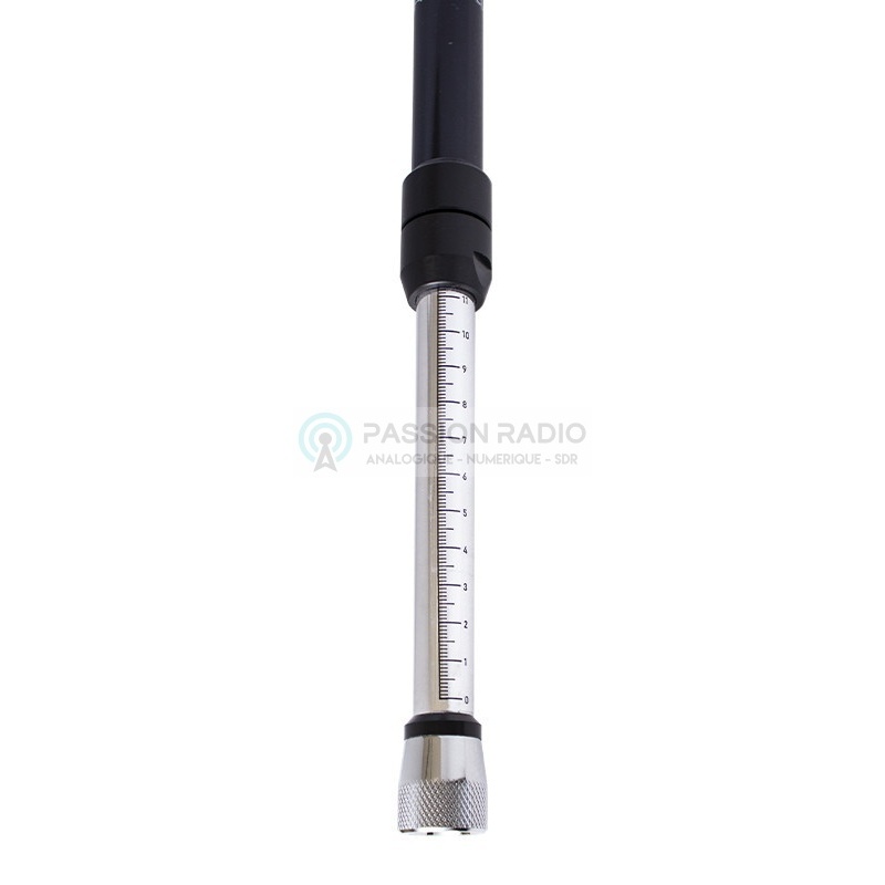 Réglable par tube coulissant à la base et brin télescopique au sommet, longueur maximum de l'antenne : 2,7m pour un poids total de 425g.