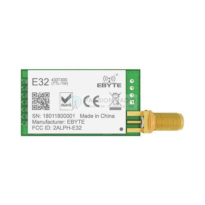 Livré avec : 1 module longue distance EBYTE E32-433T30DT (version 433 Mhz).